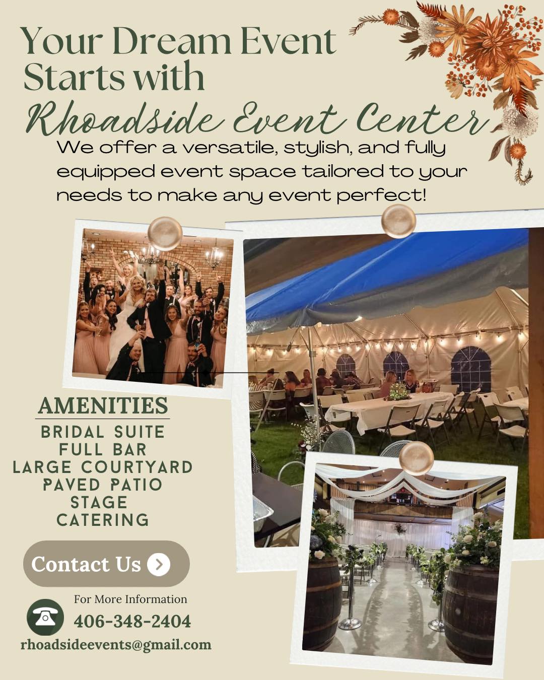 Make sure your next celebration has a beautiful backdrop. Call 406-348-2404 now to rent our event venue.